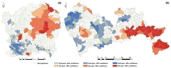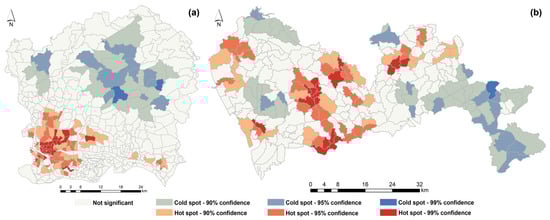 The UGI spatial agglomeration map for (a) Guangzhou and (b) Shenzhen.