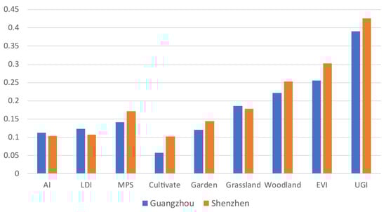 As shown in Table 4, within Guangzhou central urban districts, the UGI accounts for 33.92% of the total area, 21.41%, 4.73%, 2.26%, and 5.52%, woodland, grassland, cultivated land, and garden, respectively. For Shenzhen city, the proportion of UGI is much greater than that of Guangzhou, accounting for 45.86% of the city. The woodland, grassland, cultivated land, and garden account for 27.78%, 7.82%, 2.75%, and 7.51%, respectively. Regarding spatial configuration, the MPS and AI values are greater in Shenzhen city, indicating the clustered and continuous distribution of UGI. In contrast, Guangzhou’s MPS and AI values are relatively small, while the LDI value is large, indicating a more scattered and fragmented distribution of UGI in Guangzhou.