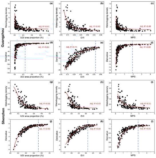 Next, we aimed to better demonstrate the impact of UGI on the urban waterlogging magnitude. According to the relative importance of UGI factors on urban waterlogging, the relationship between UGI factors (UGI area proportion, EVI, MPS) and waterlogging density was plotted (Figure 11). As for UGI area proportion (Figure 11a,g), the nonlinear fitting curve (red line) indicates that as the proportion of green infrastructure increases, the decreasing trend of urban waterlogging gradually becomes more gentle. In Guangzhou, the downward trend of urban waterlogging density is significant when the area proportion is below 15%. However, when the area proportion exceeds 20%, the decreasing rate gradually slows down, and the waterlogging density remains relatively stable. Similarly, we also found that when the proportion of UGI in Shenzhen exceeds 60%, the decreasing trend of urban waterlogging density is also not obvious. This means that if the area of green infrastructure in the watershed exceeds the threshold, continuing to increase the proportion of green infrastructure may not significantly improve its mitigation effect. By deriving the function (Figure 11d,j), we find that when the UGI proportion exceeds 24.4% and 72.1%, the decline rate of urban waterlogging gradually approaches zero. This suggests that urban waterlogging barely declines as the proportion of green space increases. Correspondingly, we can consider that 24.4% and 72.1% of UGI area proportion are the threshold values for Guangzhou and Shenzhen. It hints that the area proportion of UGI within a watershed unit needs to be maintained at a certain level to effectively exert its waterlogging mitigation effect. If the green infrastructure proportion exceeds the threshold, the mitigation effect is no longer enhanced, which indicates the saturation effect of urban waterlogging mitigation. Therefore, the area proportion of UGI within watersheds should be weighed comprehensively regarding the benefits of the urban waterlogging mitigation effect.