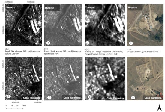 Comparison of a multi-temporal analysis of SAR-X radar images with individual treatment in the areas of the theatre (a–d), and Casa Taracena/forum (e–h).