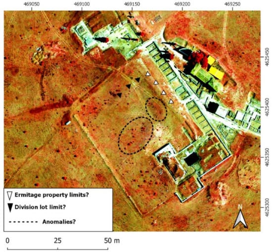 In the highest resolution RGB images (Figure 5a), no significant changes are appreciated except for a dark area located NE of the forum plaza, a short distance from the line of the forum portico. It is difficult to see a line with a NE–SW direction, and a transversal with a NW–SE direction. On the other hand, is the contrast with the image of the 1956 flight (Figure 5b), in which the separation limits of properties with the NE–SW direction, and the delimiting wall of the hermitage with the NW–SE direction can be seen first. In this case, a first reasoning may suggest that the traces seen in the first image are actually remnants of the parcel separation. However, in the photograph of the American flight 1957, there can also be seen two darker zones regarding the rest in the same area, a central area of the square, and another on its NE side.