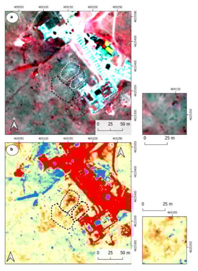 The possibility of encountering an abnormality in this area increases when we go on to analyse the IRGB images of the PNOA flights in 2007, and the IRGB image obtained from LiDAR in 2010. In the first case (Figure 6), we clearly evaluate the lines corresponding to the land division and the separation wall of the hermitage (aligned black and white triangles), but also observed in the area’s centre in front of the temple, and the lateral NE of the forum (ellipses dashed line in black) increases in a hue of red due to vegetation growth. In the second, the IR R B image (Figure 7a) allows to see, in the central part, the reverse situation in two areas (polygon with a blank dashed line). This indicates a slower growth of vegetation and a lack of humus area most to this increase, creating two areas in the centre. The PCA analysis (Figure 7b), indicates that those construction elements (buildings, roads, etc.) present a red hue, which is repeated in the two areas mentioned above. It should be noted that, in this case, both images are apparently present on the W side of the square, shown as an arrangement of perpendicular lines.