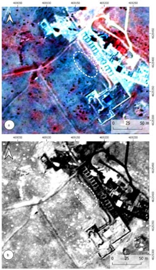 The analysis of the 2016 TripleSat image (Figure 8a) shows another abnormality in the area in front of the NE side of the porch of the forum (ellipse dotted line in black). In this case, apparently, it gives rise to two quadrangular delimited spaces. The NE–SW alignments do not coincide with the crop parcel subdivisions from the 1956 flight. The PCA analysis of the multispectral image shows a similar result in the first component (Figure 8b).