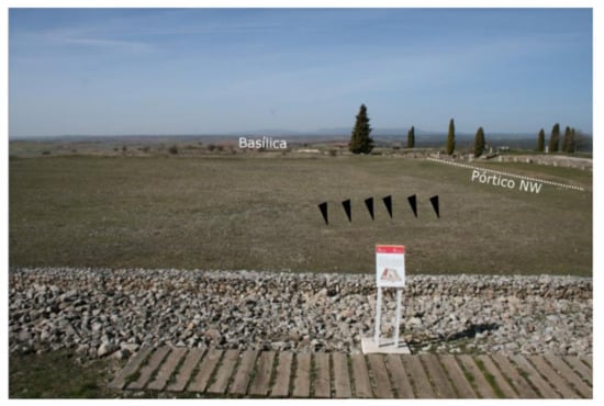 However, the excavated remains correspond to large public spaces such as the theatre, the forum, thermal complexes (Los Arcos), and large private spaces such as the so-called Casa Taracena. Furthermore, the urban organization of the city does not correspond to a homogeneous structure, but on the contrary, the provisions of both large public and private constructions would add up to four possible different orientations (Figure 2).