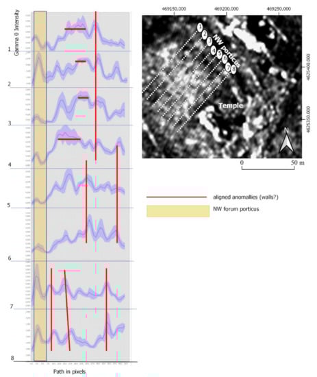 We wanted to perform a deeper analysis of the X-SAR image. To do this, we proceeded to draw eight lines with a NE–SW orientation with the intention of obtaining the intensity reading profiles (Figure 11). The SNAP program allows the creation of these profiles from the tracing of polylines on the image. Observation of the graphs of profiles applied to the obtained X-SAR image shows a first peak, or followed by a concavity we have identified as the border of the portico of the forum and the drainpipe. From here, we can find that the peaks of the curves tend to occur successively in the same position of each of the samples taken. This could be indicating the presence of longitudinal intrusive elements (vertical lines in Figure 11). On the other hand, in some of the profiles we evaluated the presence of profiles, in which the peak is maintained for several meters with few alterations (horizontal lines in Figure 11), indicating that we may be facing intrusive longitudinal elements, coinciding approximately with the orientation of the profile line. Therefore, apparently, it seems that the radar is detecting possible construction elements.