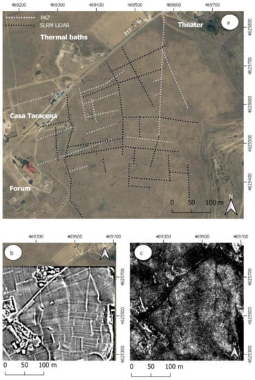 As mentioned, it was in this area where our team [1] had determined the presence of traces of urban organization with a N/S orientation, in this case applying other techniques and digital sources, such as SPOT-5 images. In this case, we have contrasted results of the radar image (Figure 12b) with the application of the SLRM function (Figure 12c) to the DTM obtained from the LiDAR point cloud. The use of the second type technique produces better results than in the first case. These can be seen in Figure 12a.