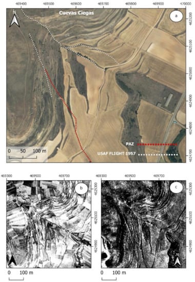 (a) Google satellite QuickMapServices; (b) Result of the simple local relief model (SLRM) function on the DSM obtained from LiDAR PNOA; (c) Image resulting from the multi-temporal application of the co-register function with five SAR-X images of PAZ.