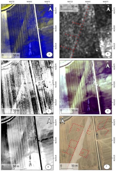 The observation of the site of Rodeles II (Figure 15) has allowed us to find PNOA images from 2011, in which it was possible to identify the structures almost at the same level of visualization and clarity of the aerial photographs taken in this area. These structures can also be seen in the infrared image of LiDAR of the PNOA flight. To complete the works, we carried out PCA analytics and a calculation of the vegetation indices, among which the Perpendicular Vegetation Index [42] (Figure 15e) has stood out. When compared with the radar image resulting from the multi-temporal treatment, we saw that the media operation has left evidence of the anomaly of the track, but lost the information corresponding to the structures associated with the funeral area. For this reason, we carried out an individual treatment of one of the PAZ images, the one from 29 August 2019, which reveals the presence of the aforementioned structures that perpendicularly cross the funeral via (Figure 15b).