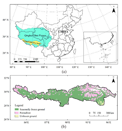 Location of the Yarlung Zangbo River Basin (YZRB) (a) and distribution of permafrost in the YZRB (b) obtained from the National Tibetan Plateau Data Center (http://data.tpdc.ac.cn/zh-hans/ (accessed on 12 January 2020)), which was based on the new map of permafrost distribution on the Qinghai–Tibet Plateau (QTP) (Zou, Zhao, and Sheng, 2017) [38].