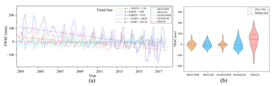 Comparison of the variation trend (a) and amplitude (b) of TWSC based on ERA5 and GLDAS with the results derived from GRACE from 2003 to 2017. ERA5-PER represents TWSC estimated by the PER method based on ERA5; ERA5-SS represents TWSC estimated by the SS method based on ERA5; GLDAS-PER represents TWSC estimated by the PER method based on GLDAS; GLDAS-SS represents TWSC estimated by the SS method based on GLDAS; GRACE represents the TWSC derived from GRACE. The dashed line in Figure 2a represents the corresponding trend line.