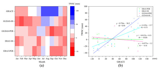Comparison of multi-year monthly average value of TWSC based on ERA5 and GLDAS with the results of GRACE (a) and correlation coefficients (b). ERA5-PER represents the multi-year monthly average TWSC estimated by the PER method based on ERA5; ERA5-SS represents the multi-year monthly average value of TWSC estimated by the SS method based on ERA5; GLDAS-PER represents the multi-year monthly average value of TWSC estimated by the PER method based on GLDAS; GLDAS-SS represents the multi-year monthly average value of TWSC estimated by the SS method based on GLDAS; GRACE represents the multi-year monthly average value of TWSC derived from GRACE.