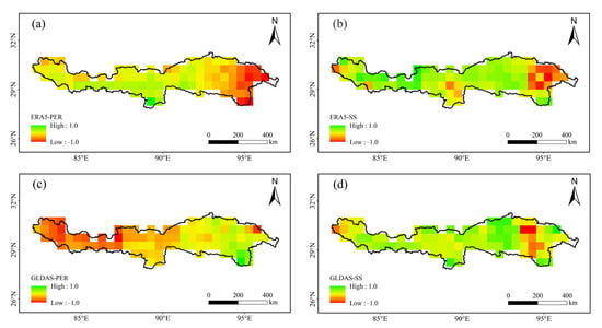 Spatial distribution of the correlation coefficients between TWSC based on ERA5 and GLDAS and results derived from GRACE. ERA5-PER (a) represents the correlation coefficients between TWSC estimated by the PER method based on ERA5 and results from GRACE; ERA5-SS (b) represents the correlation coefficients between TWSC estimated by the SS method based on ERA5 and results from GRACE; GLDAS-PER (c) represents the correlation coefficients between TWSC estimated by the PER method based on GLDAS and results from GRACE; GLDAS-SS (d) represents the correlation coefficients between TWSC estimated by the SS method based on GLDAS and results from GRACE. The unit is “1”.