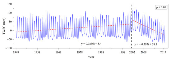 As shown in Figure 5, TWSC in the YZRB showed a significantly increasing trend (p < 0.01) during 1948–2017, but an abrupt change to a decreasing trend occurred in 2002. Specifically, TWSC in the YZRB showed a significantly increasing trend with a rate of 0.0236 mm/month before 2002 (p < 0.01) and a significantly decreasing trend with a rate of 0.397 mm/month after 2002 (p < 0.01). This is consistent with the results of Liu et al. [62] in a study of the dry and wet transition characteristics of the YZRB; the YZRB showed an overall wetting trend from 1982 to 2015, but the basin showed a significant aridity trend after the turn of the 21st century.