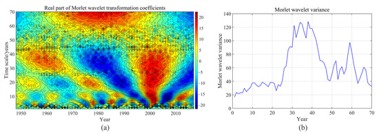 Wavelet analysis results of TWSC in the YZRB from 1948 to 2017. Time–frequency distribution of the real part (a) of the Morlet wavelet transform coefficients (red represents a high value of TWSC, and blue represents a low value of TWSC). Wavelet variance map (b) (the year corresponding to the peak value is regarded as the main cycle).