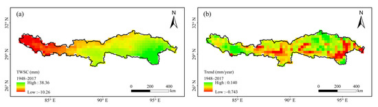 Spatial distribution of multi-year average value of TWSC (a) and variation trend of multi-year average of TWSC (b) in the YZRB from 1948 to 2017.