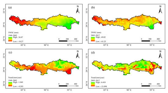 Spatial distribution of multi-year average value of TWSC (a,b) and variation trends of multi-year average of TWSC (c,d) before and after 2002, respectively.