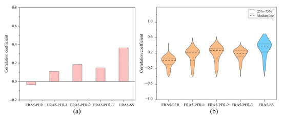Time-lag effect of TWSC (a) and range of correlation coefficients (b) estimated by the PER method based on ERA5. ERA5-PER represents the correlation coefficient between TWSC estimated by the PER method based on ERA5 and results from GRACE; ERA5-PER-1 represents the correlation coefficient between TWSC estimated by the PER method based on ERA5 with a lag of 1 month and results from GRACE; ERA5-PER-2 represents the correlation coefficient between TWSC estimated by the PER method based on ERA5 with a lag of 2 months and results from GRACE; ERA5-PER-3 represents the correlation coefficient between TWSC estimated by the PER method based on ERA5 with a lag of 3 months and results from GRACE; ERA5-SS represents the correlation coefficient between TWSC estimated by the SS method based on ERA5 and results from GRACE.