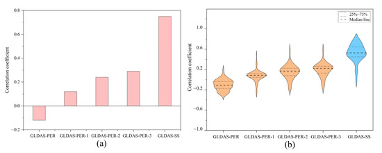 Time-lag effect of TWSC (a) and range of correlation coefficients (b) estimated by the PER method based on GLDAS. GLDAS-PER represents the correlation coefficient between TWSC estimated by the PER method based on GLDAS and results from GRACE; GLDAS-PER-1 represents the correlation coefficient between TWSC estimated by the PER method based on GLDAS with a lag of 1 month and results from GRACE; GLDAS-PER-2 represents the correlation coefficient between TWSC estimated by the PER method based on GLDAS with a lag of 2 months and results from GRACE; GLDAS-PER-3 represents the correlation coefficient between TWSC estimated by the PER method based on GLDAS with a lag of 3 months and results from GRACE; GLDAS-SS represents the correlation coefficient between TWSC estimated by the SS method based on GLDAS and results from GRACE.