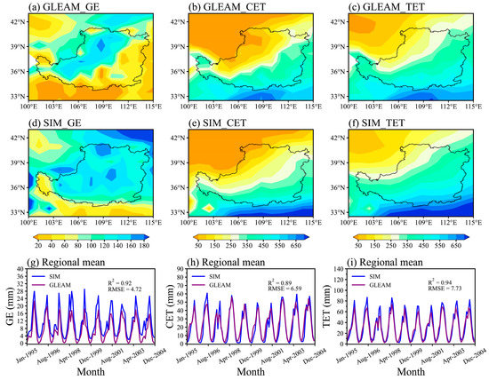 The CLM performance in the ET simulation was evaluated by comparing the simulated GE, CET, and TET values with GLEAM datasets from 1995 to 2004 (Figure 4). In general, the CLM performed well in capturing the dominant spatial pattern of annual average GE, CET and TET, showing a high magnitude in the southeastern LP and low magnitude in the northwestern LP; however, there were overestimations for GE (Figure 4a), which were clearly observed in the area-averaged monthly time series (Figure 4g). The simulated CET and TET had consistent fluctuating trends with the GLEAM-based monthly time series (Figure 4h,i). To further evaluate the performances quantitatively, the R2 and RMSE between simulated and GLEAM-based area-averaged monthly series were calculated. The obtained high R2 (ranging from 0.89 to 0.92) and low RMSE (ranging from 4.72 to 7.73) indicated good performance for the CLM in reflecting the spatiotemporal pattern of ET on the LP.