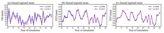 Figure 5 depicts a comparison of the area-averaged annual ET for the two simulations. The simulated GE showed clear differences in their annual time series, and the GE of LC2015 was higher than that of LC2000; however, the CET showed opposite responses to vegetation coverage change, with a larger CET under LC2015 in comparison with LC2000. Consequently, the simulated TET did not show evident differences between LC2000 and LC2015, because the positive effect of VR on CET was offset by the negative effect of VR on GE. The spatial variation in annual average ET associated with VR is illustrated in Figure 6. The whole LP region, except for the small area of the central part and northern edge, showed decreased GE due to vegetation coverage changes from LC2000 to LC2015, particularly in the eastern LP, where GE decreased by more than 15 mm, with a statistical significance level of 0.05 (Figure 6c). The CET showed opposite responses to vegetation coverage change compared with GE, and LC2015 had a higher CET in the western and southeastern LP, with magnitudes ranging from 2 to 6 mm (Figure 6f). Due to the offset between GE and CET in the process of VR, the TET variation at the annual scale showed a complex and inconsistent pattern in the LP region, with magnitudes ranging from −4 to 2 mm (Figure 6i).