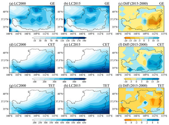 Spatial pattern of the simulated annual average ET (unit: mm) and differences (LC2015 minus LC2000) between LC2000 and LC2015 on the LP. The first column (a,d,g) and second column (b,e,h) show simulated ground evaporation, canopy ET and total ET under LC2000 and LC2015, respectively, and the third column (c,f,i) shows differences in ground evaporation, canopy ET and total ET between LC2015 and LC2000. Areas with significant differences (p < 0.05) based on t-tests are stippled.