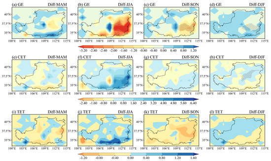 Seasonally, the spatial patterns of the responses of GE to vegetation change were similar among the four seasons, showing a consistent decrease in the eastern LP, while the magnitudes varied. June, July, and August (JJA) had the largest decreases, ranging from −3.20 to −2.00 mm, followed by September, October, and November (SON) ranging from −2.00 to −0.80 mm, and December, January, and February (DJF) with approximately 0.40 mm, with a statistical significance level of 0.05 (Figure 7b–d); however, the responses of CET varied among the four seasons. Nearly the whole LP region showed a dominant increase in CET in JJA with vegetation cover change from 2000 to 2015. The largest increase was found in the eastern LP, with a value of approximately 0.8 mm, and the increased magnitudes decreased in the northwest direction (Figure 7f). During SON, mixed negative and positive responses were observed with magnitudes varying from −0.8 mm in the north to 0.8 mm in the southeast (Figure 7g). Notably, the area with increased ET changed in DJF, showing a significant increase in the northeastern LP and a nonsignificant increase in the western LP, where the grassland clearly increased (Figure 7h). The overall change in TET is inconsistent among the four seasons due to the different responses of GE and CET. Nearly the whole LP exhibited increased TET in JJA (Figure 7j), while the TET decreased in the whole LP during March, April, and May (MAM) and SON with vegetation coverage changes from 2000 to 2015, particularly in the eastern LP (Figure 7i,k). During DJF, only a small area in the southern LP had a decreased TET, and most LP regions exhibited an increased TET (Figure 7l).
