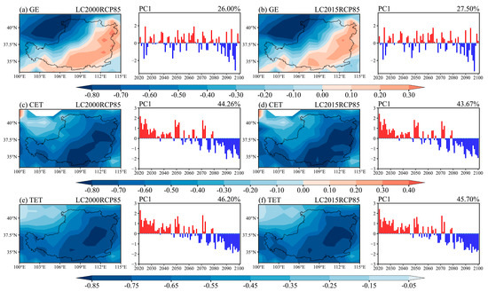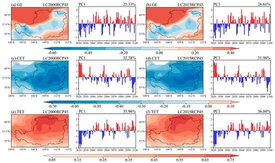 To evaluate the dynamic change in ET associated with VR and climate change over the LP region, the main leading modes of long-term variability were revealed using EOF analysis. We only presented the first EOF modes (EOF1) for analysis, because EOF1 explained more than 25% of the total ET variances, while the second EOF and third EOF modes explained less than 15% and 9% of the variance, respectively. The EOF1 modes of GE for LC2000RCP45 and LC2015RCP45 reflected consistent spatial patterns, showing opposite GE variations between the northern LP and zonal region extending from the central-western area to the east over the LP (Figure 8a,b). Combined with the EOF1 spatial pattern and temporal coefficients, GE exhibited an increasing trend before 2040 in the central-western and central-eastern area, while GE had a decreasing trend most of the time after 2040, in which LC2015RCP45 had a more pronounced change than LC2000RCP45. The EOF1 modes of CET for LC2000RCP45 and LC2015RCP45 showed consistent negative values in their respective spatial patterns, and the time coefficients featured downward trends (Figure 8c,d), indicating that CET increased during 2021–2100, with a more pronounced increase in LC2015RCP45. For TET, the spatial pattern of variability showed a positive value in the whole LP region (Figure 8e,f), which reflected an increasing trend of TET during 2021–2100 by combining with the upward trends exhibited in the time coefficients.