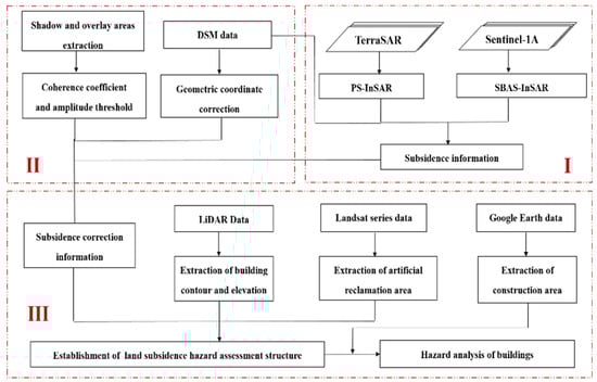 This study focuses on the improvement of the geolocation quality of Sentinel-1A and TerraSAR-X derived PSs and on classifying structures to detect the hazard associated with urban buildings under land subsidence in Shenzhen by an integrative use of InSAR and LiDAR techniques. Section 2 describes the methods to capture the specific subsidence of buildings including the acquisition of radar scatters, the removal of invalid radar scatters, the association of radar scatters with the lidar points, the approach to classify radar scatters along the contour line of buildings, and the establishment of a hazard assessment method. The different structures of our test site, the city of Shenzhen, especially its construction sites and reclamation areas, are depicted in Section 3; Section 4 addresses the experimental results and discusses the hazard assessment system concerned with building subsidence. The conclusions follow in Section 5.