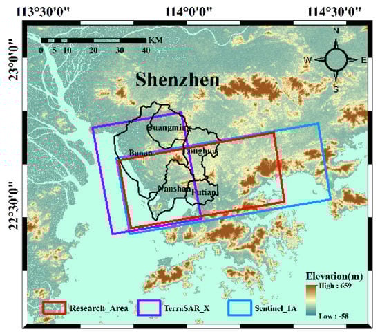 The area selected for our investigations is the city of Shenzhen, which is located in the south of the Guangdong Province in China. Numerous large-scale land reclamation projects have been implemented to meet the requirements for rapid economic development and the increasing demand for urban expansion. Figure 2 shows the study area and the regions recorded for analyses by TerraSAR-X and Sentinel-1A spaceborne instruments. It further displays the significant margin between the coastline of the 30 m SRTM DEM obtained in the year 2000 (color image) and the coastline of the current district boundary map (black line) obtained in 2020, attributable to huge land reclamation projects. Such large-scale reclamation of land was not given enough time to realize the sufficient deposition of unstable alluvial clay. Thus, the soils became compacted under the pressure from high-intensity constructions and self-consolidation of the clay. The compaction process led to ground deformations, resulting in serious environmental problems such as obvious land subsidence, which, in the worst case, can lead to the inclination and collapse of buildings. These ongoing slow but dangerous processes represent a serious future danger for Shenzhen, which demands precise monitoring and careful hazard analyses of building in the future [39,40].
