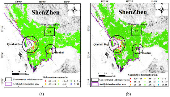 (a) Annual vertical subsidence rates based on Sentinel-1A images; (b) cumulative vertical subsidence rates from March 2017 till April 2020 based on Sentinel-1A images. C1 to C3, see text.