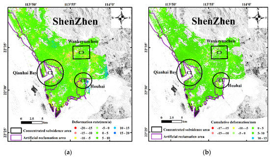 Land subsidence rates in Shenzhen were calculated by applying the classical and multi-temporal InSAR techniques to the Sentinel-1A and Terra-X SAR data. The available 81 ascending Sentinel-1A images were used for calculations based on the SBAS algorithm. Two key parameters, including time baseline and space baseline, were set to 75D and 150 m, respectively. Then, 333 differential interference pairs with high quality were computed with a multilook factor of 4 × 1 in range and azimuth directions, leading to a 15 × 15 m pixel size on the ground. The minimum cost flow method was used for phase unwrapping, with the coherence threshold set to 0.2. Atmospheric errors were corrected by a polynomial model and atmospheric filtering. This method computes land subsidence time series and residual topographic heights using the SVD least-squares inversion technique. The velocity fields were obtained by using a stacking technique [41]. Figure 3 shows the vertical subsidence rates per year and the cumulative vertical subsidence rates from March 2017 till April 2020. The positive value (blue color) of velocities indicates that the surface rises in the vertical direction, and the negative value (red color) indicates that the surface sinks. It is found that the vertical line-of-sight velocities range from −40 mm to 12 mm, with the largest subsidence position located near the Bao’an Airport.