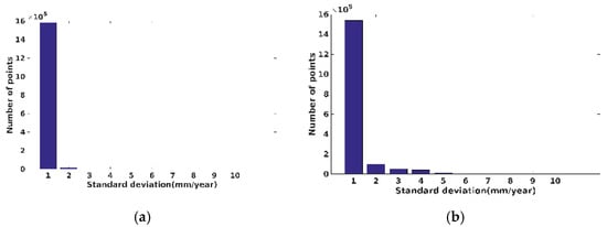 Distribution of the standard deviation of land subsidence rates: (a) Sentinel-1A recordings; (b) TerraSAR-X recordings.