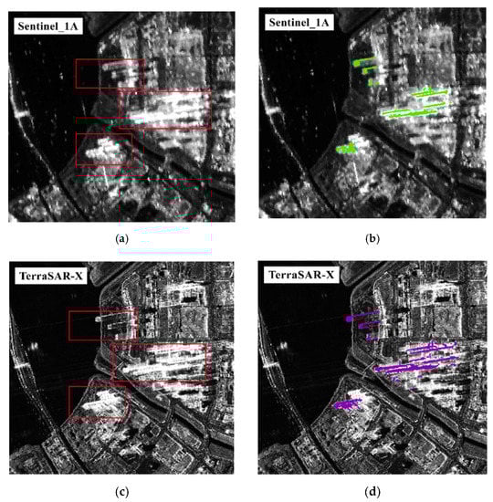 (a) Sentinel-1A image of the Qianhai Bay; (b) layover areas in the Sentinel-1A image; (c) TerraSAR-X image of the Qianhai Bay; (d) layover areas in the TerraSAR-X image.