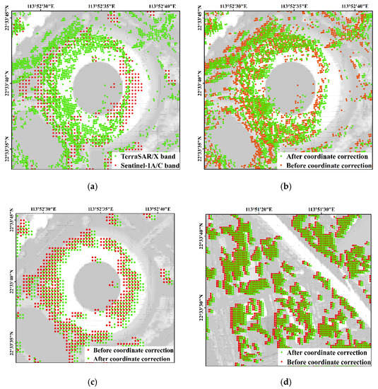 (a) Superposition effect of SAR PS points based on two bands and DSM data. Red and green represent the PS points based on Sentinel-1A and TerraSAR-X images, respectively; (b) geometric correction of TerraSAR-X subsidence for buildings; (c,d) geometric correction of Sentinel-1A subsidence for buildings.