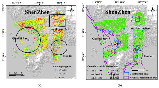 (a) Contour and height of buildings based on LiDAR data; (b) artificial reclamation area, construction area and vertical deformation rate of buildings from March 2017 to April 2020 based on Sentinel-1A images. Locations of time series data: A = Ali Center, B = Qianwan law building, C = Vanke Cloud city, D = and Yuehaimen zone.