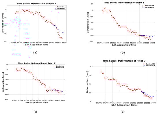 Time series of four specific locations within the subareas were selected and the respective subsidence rates were calculated based on TerraSAR-X and Sentinel-1A data (Figure 9.) Point A is located in the Ali Center near Houhai Dengliang. The center subsided slowly in the early stage while rapidly sinking in the later stage. Point B is located near the Qianwan law building, and its changes over time are smooth and linear. There is a large number of deformations near this target point, and it is verified that the area has been leveled during the monitoring period. Point C is located near Vanke Cloud city, and the target point of this position was subsiding with time in the early stage. Point D is located near the Yuehaimen zone, and the target point of this position is subsiding with time. Subway line 12 is being built near this point, and the subsidence is surely caused by construction activities in the underground. The subsidence trend of the two types of SAR data over time is basically comparable. The verification through information about ground consistency and construction schedules unveil the encountered subsidence as primarily caused by the existing subsurface conditions and the weight of high-rise buildings. Furthermore, the high rates of subsidence mainly occur during the time of construction. In the future, the local authorities may consider a longer necessary timeframe for natural soil compaction in artificial reclamation areas or instigate the utilization of available human-made techniques to densify the underground further.
