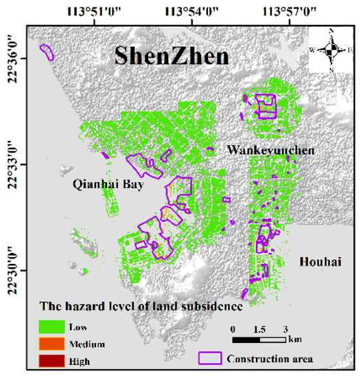 The contours and heights of buildings in the major subsidence areas were automatically extracted based on the airborne LiDAR data (Figure 8a). The subsidence hazard level for the respective buildings was evaluated by Equation (6) according to the land subsidence hazard assessment system. Proportionally to the calculating weighted value, the building risk level was divided into three levels including low (less than or equal to 1.2), medium (greater than 1.2 and less than or equal 1.6), and high levels (greater than 1.6). A color code indicates three levels of risk associated with individual subsidence for each building in the area (Figure 10). It is found that some medium and high-hazard buildings display in major subsidence areas in Figure 10, especially in the artificial reclamation area of Qianhai Bay and Houhai and less in the Vanke Cloud city. Corresponding to the construction area for calculation, the risks of individual buildings and building blocks generally increase, especially for those located closer to the coastline. This seems logical in some way, as the consolidation of the ground might decrease with the age of the reclaimed land and thus with the distance to the seashore. Furthermore, it is found that the high-rise buildings were built continuously during 2017–2020 in Qianhai Bay and Houhai. The medium and high-risk individual buildings are almost all located in the construction area marked with a magenta color line. This is basically consistent with the results of the assessment system where the urban construction activities dominate the land subsidence of urban buildings in Shenzhen. Slightly different from the results of other researchers, hazard buildings are mainly caused by building construction operation but less affected by the natural subsidence of artificial reclamation area and the subsidence of building weight, which also shows that the government and part of the government are wise in decision making. Moreover, it must be noted that different techniques of construction may additionally influence the subsidence levels of high-rise buildings; therefore, their dislocations and safety should be strictly controlled during the whole construction process and the subsequent years till their final consolidation. Of course, it is worth noting that land subsidence in Shenzhen has existed for a long time; thus, continuous monitoring of building subsidence is also very important.