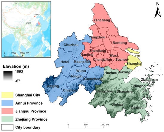 The YRDUA is one of China’s most economically active, open and innovative regions, which covers Shanghai municipality and the provinces of Anhui, Jiangsu, Zhejiang (Figure 1). The entire region consists of 26 prefecture-level cities that cover an area of 211,700 km2. Following the YRDUA development plan approved by the State Council, the whole region is designed as an urban network including one core megacity (Shanghai) and five metropolitan circles (Nanjing, Hangzhou, Ningbo, Hefei, and Suzhou-Wuxi-Changzhou). By 2019, the gross domestic product (GDP) of the study area reached over 19.73 trillion yuan, and its population reached nearly 155.53 million, accounting for 20% and 11% of the national total, respectively. With an aggregate population and economic output, the YRDUA boasts strategic significance in the country’s modernization and further opening-up, making its regional integration crucial for leading China’s high-quality development.