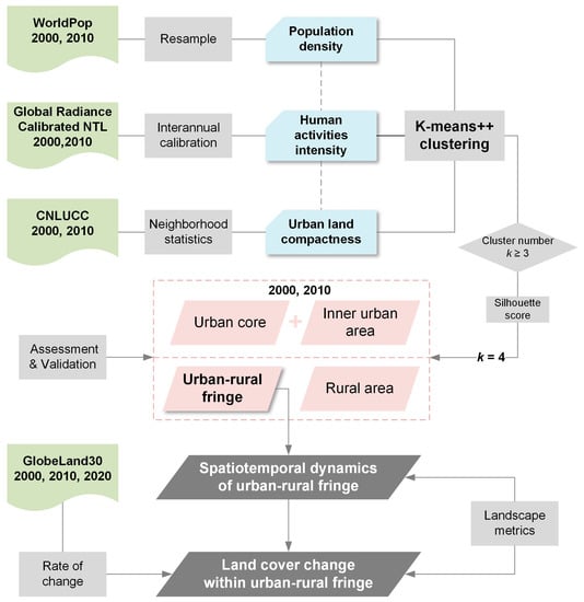 - Feng, Z.; Peng, J.; Wu, J. Using DMSP/OLS nighttime light data and K–means method to identify urban–rural fringe of megacities. Habitat Int. 2020, 103, 102227. [Google Scholar] [CrossRef]