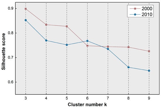 An iterative clustering process with a range of cluster number settings was firstly performed to generate intermediate results to determine the final URF boundary. We then preliminarily selected the optimal cluster number based on the silhouette score of each output. Figure 3 shows that the average silhouette score value gradually decreased when the cluster number k increased and the values tended to be convergent in both 2000 and 2010. In this regard, the trichotomy (k = 3) with the highest silhouette score has the best performance in clustering these spatial indicators. However, we found that this trichotomy was evidently not conforming with the ground truth through visual interpretation and comparison. Therefore, we set the optimal cluster number k as 4 for the demarcation of URF, as it provided a more credible classification.