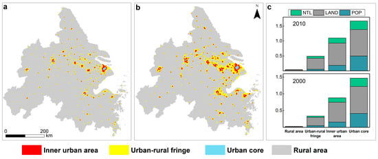 The urban–rural classification of the YRDUA for (a) 2000 and (b) 2010, and (c) the average value of the three normalized indicators for each subclass.
