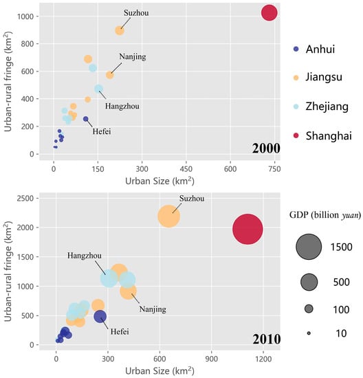 As is depicted in Figure 5, the expansion of URF was synchronized with urban growth across the study area, while the size of the delineated URF was varied markedly among different cities. As the regional growth pole, Shanghai took the leading position in its URF size initially, whereas it was transcended by Suzhou whose URF area sharply increased from 896 km2 to 2190 km2 in 2010. In contrast to the fast-developing cities of coastal regions, cities in Anhui Province have mostly experienced a relatively slow development of URF, and the gap between central cities and the rest has immensely widened in this decade. We also observed that the magnitude of URF growth was obviously greater than urban areas, while the growth rate of URF for most cities was lower than urban areas in the study area. Compared to the high speed of urban sprawl, URF area in the YRDUA have encroached on the countryside with a relatively lower speed. Besides, the area of URF is highly correlated with the urban area and GDP, which indicated that the economic growth and urban expansion posed a strong and positive impact on the URF growth in the YRDUA.