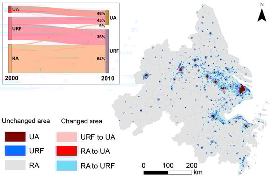 Figure 6 displays the spatiotemporal patterns and conversion types between the subclasses of the urban–rural classification in the study area. The changed pixels were mainly distributed at the periphery area of coastal cities with higher development level. Nearly a half of urban areas were transformed from the URF from 2000 to 2010, suggesting that the majority of urban growth occurred in the URF. What remained unchanged were those dispersedly distributed URF patches with smaller size. This type of URF barely transformed into urban area, and only show a slight incremental change. Rural urbanization is an important driving force of these isolated URF areas, but it cannot drastically alter the rural landscape into densely built area.