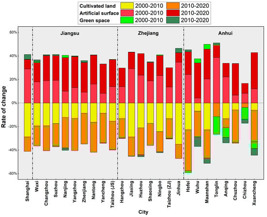 For the land cover change trajectory between the two periods, this proportional conversion between cultivated land and artificial surface demonstrated obvious inter-provincial differences and intra-provincial similarities. For instance, artificial surface growth rate of URF in Shanghai (25.54%) from 2000 to 2010 was much higher than the subsequent period (7.98%), and its absolute value of change ratio of cultivated land decreased from 28.87% to 12.30%. The rates of land cover changes for Zhejiang Province also presented a moderate tendency shift from high change rates to relatively lower rates, except Hangzhou and Taizhou were relatively steady and consistent for the two time periods. In contrast, the rate of artificial surface change for the URF of Jiangsu Province greatly increased (range from 16.32% to 28.57%) in 2010–2020 compared to the previous period (range from 6.98% to 16.22%). There is no obvious pattern for Anhui Province in that the land cover change ratio varied strongly across different cities.