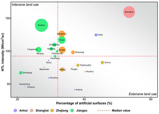 The average value of NTL intensity and percentage of artificial surface of the URF in 2010, the bubble size represents the URF area.