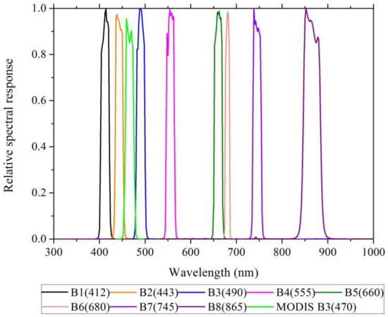 On 26 June 2010, South Korea launched the world’s first geostationary ocean color satellite onboard Imager (GOCI), which is mounted on the Communication, Ocean and Meteorological Satellite (COMS) [6]. It contains eight bands, the first, second and third bands are all blue bands (Table 1). GOCI sensor is mainly used to continuously detect ocean water color at high time and frequency from a stationary remote sensing platform, and to study the changing processes of the ocean, land, and atmosphere. The GOCI satellite is centered on 130 ° E longitude and 36 ° N latitude to observe the earth, with a spatial resolution of 500 m and a fixed coverage area of 2500 km × 2500 km. It scans the area 8 times every day from 8:30 a.m. to 15:30 p.m. Beijing time, and obtain 8 images with a time interval of 1 h. The data can be achieved from http://kosc.kiost.ac.kr/gociSearch/list.nm?menuCd=50&lang=en&url=gociSearch (accessed on 20 April 2021) [16,17,18].
