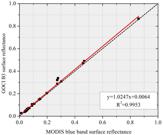 Using the band response function of GOCI and MODIS sensors in the blue band, linear regression analysis is performed on the ground object spectrum data (Figure 3). It can be seen that there is a certain difference in reflectance between MODIS and GOCI sensors in the blue band. In general, the surface reflectance of GOCI is greater than that of MODIS. The conversion model is shown in Equation (6), and the fit is above 99%.