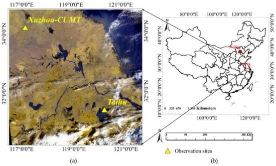 Global Aerosol Robotic Network (AERONET) is a global aerosol optical characteristics monitoring network established by NASA [8,27,28]. AERONET observation parameters include AOD, single scattering albedo, birefringence index, and scattering phase function, etc., by measuring the radiance of different bands, different directions, and different times, the solar photometer can obtain the AOD of the whole atmosphere layer. AERONET data have been commonly used in the verification of global aerosol transport and aerosol retrieval results [4,29,30]. The number of samples of data available at AERONET 2.0 level is very limited, and thus to ensure enough verification data, this study uses AERONET 1.5 level data (AERONET version 3) to verify the retrieval results [31,32]. Two stations in Taihu and Xuzhou-CUMT were used to verify our retrieved AOD in this study (Table 2). The AOD provided by the Second Simulation of the Satellite Signal in the Solar Spectrum (6S) is the data at the band of 550 nm, but the data released by AERONET does not have 550 nm AOD data. Therefore, the AOD data of other bands (440 nm, 870 nm, 1020 nm) provided by AERONET are used to fit the AERONET AOD value of 550 nm through Equation (1), which is used to verify the AOD retrieved from remote sensing: