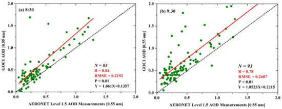 - The algorithm proposed in this study for retrieving AOD using GOCI data is feasible and it can be used to retrieve AOD with high temporal resolution. Using Taihu and Xuzhou-CUMT stations for verification, it can be seen that R can reach 0.84 (8:30 a.m.), and the minimum RMSE is 0.2077 (11:30 a.m.) and 0.1937 (10:30 a.m.), respectively.