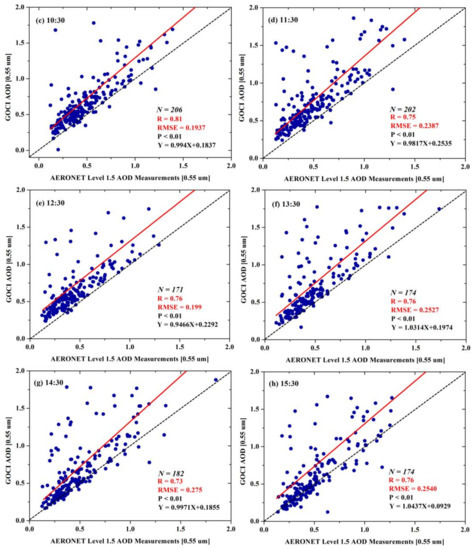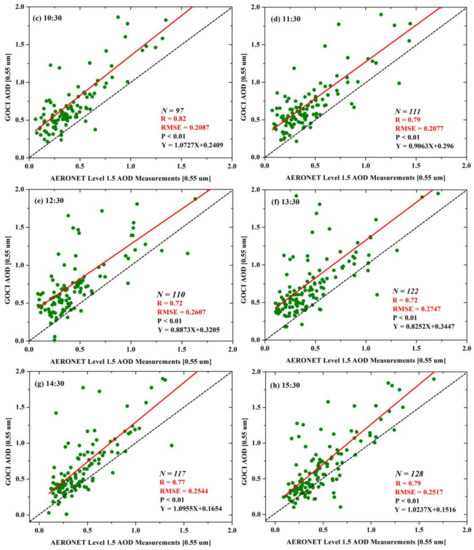 Comparison between AOD retrieved from GOCI images and Xuzhou-CUMT station measurements (The upper left corner indicates the sensor observation time, N is the number. (a–h) are the verification results of 8:30 a.m.–15:30 p.m., respectively).
